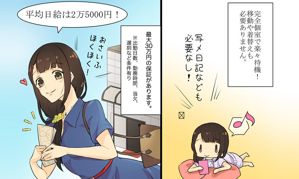- 入店について一番心配なのは、実際お客さんがいるのか、嘘はないのかということ。当店「ミヤコ」では、最大30万円保証(※出勤日数、勤務時間、当欠、遅刻など条件有り)という安心の保証制度があります。それ以上の集客力があるため、その金額以下になることはあり得ませんが、安心・安全に、そして何より女性セラピストの貴女に信頼していただくため、お仕事のスキルアップに集中していただくため、貴女のお給料の保証を3ヶ月させて頂きますので安心してお勤め下さい。